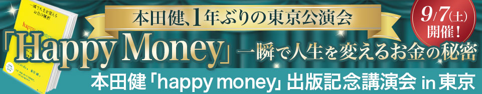 今回の出版記念講演会では、このHappy Moneyの作り方を中心に、仕事を通じて、Happy Moneyを受け取りやすくする方法や、お金の不安の解き方、複数のお金の流れを創り出す秘訣など、本田健が世界中のメンターに教わり、実践してきたお金についての様々な知恵と秘密を、たっぷりお伝えします。